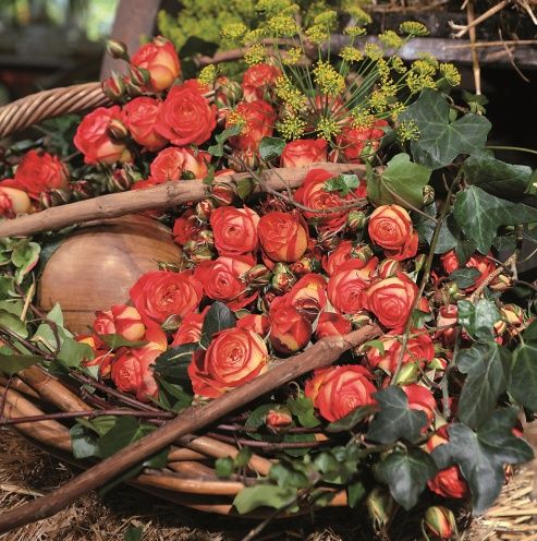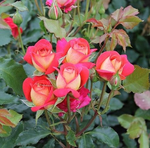 Выразительный сорт. Цветки средних размеров, насыщенного оранжево-красного цвета с желтой изнанкой лепестков, густомахровые, квартированные. Появляются в небольших кистях на крепких цветоносах. Очень выносливая роза.