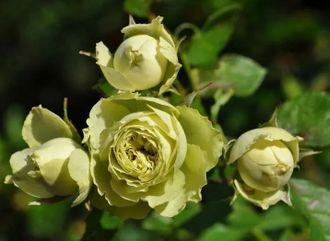 Белые с салатовым оттенком и румянцем на крайних 60-70 лепестках цветки, шаровидной формы, очень плотно набитые, в небольших соцветиях появляются в течение всего сезона.