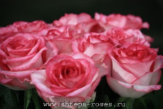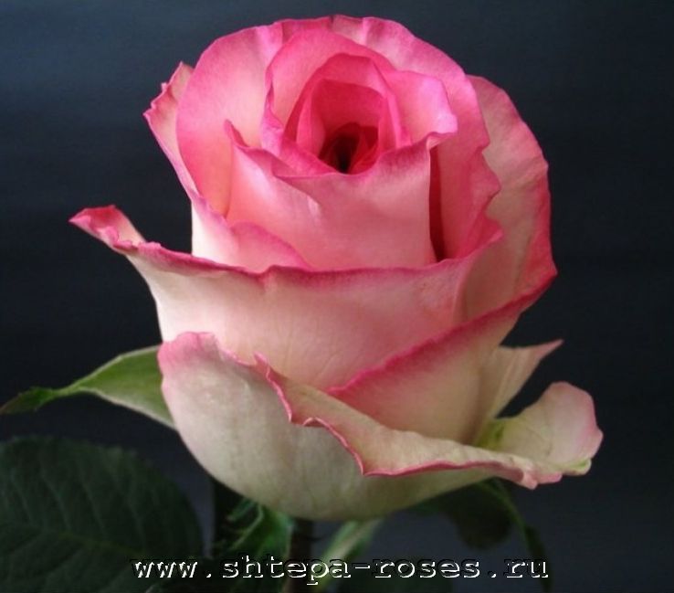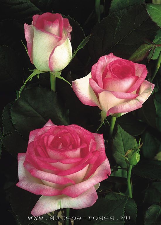 У этой срезочной розы бокаловидные цветки из 17-25 лепестков двухцветной окраски: белый с широкой темно красной каймой. Листва темно-зеленая, глянцевая, куст практически без шипов.