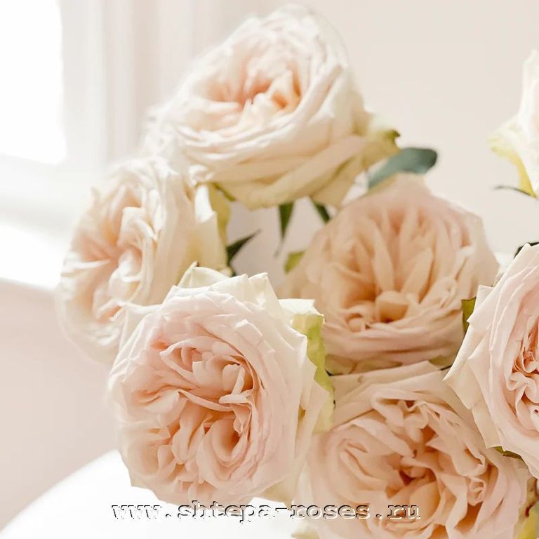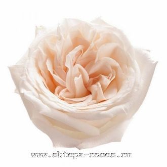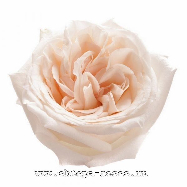 Современная срезочная садовая роза. Крупный цветок белой окраски с оттенком слоновой кости. Форма цветка изысканная, сочетает в себе классический бокал с квартированным центром. Внешние лепестки изогнуты "уголком". Центр цветка слегка розовеет.